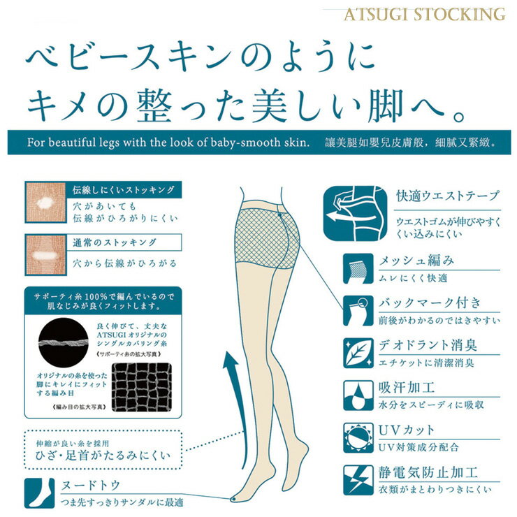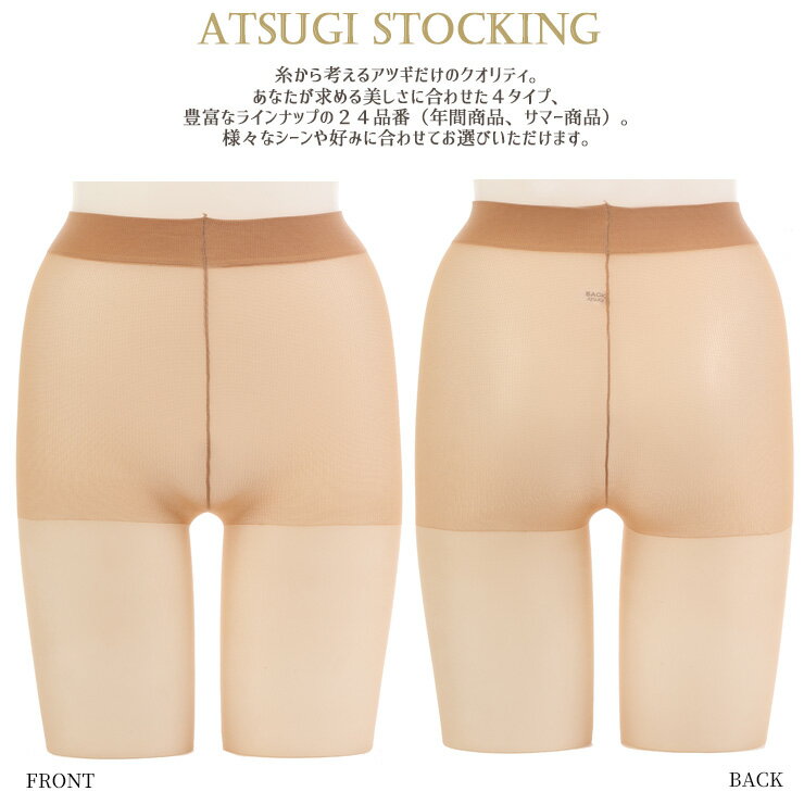 サイズ M〜L(身長:150-160cm、ヒップ:85-98cm) L〜LL(身長:155-170cm、ヒップ:90-103cm) 特徴 ATSUGI STOCKING(アツギストッキング) 糸から考えるアツギだけのクオリティ。